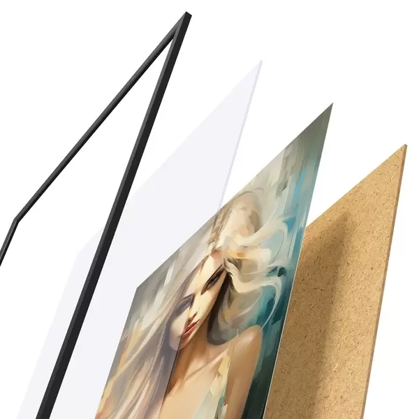 Plakát se skládá z rámu, plexiskla, tištěného obrazu a dřevotřískového podkladu. Díky úchytům na zadní straně lze plakát ihned zavěsit na zeď.