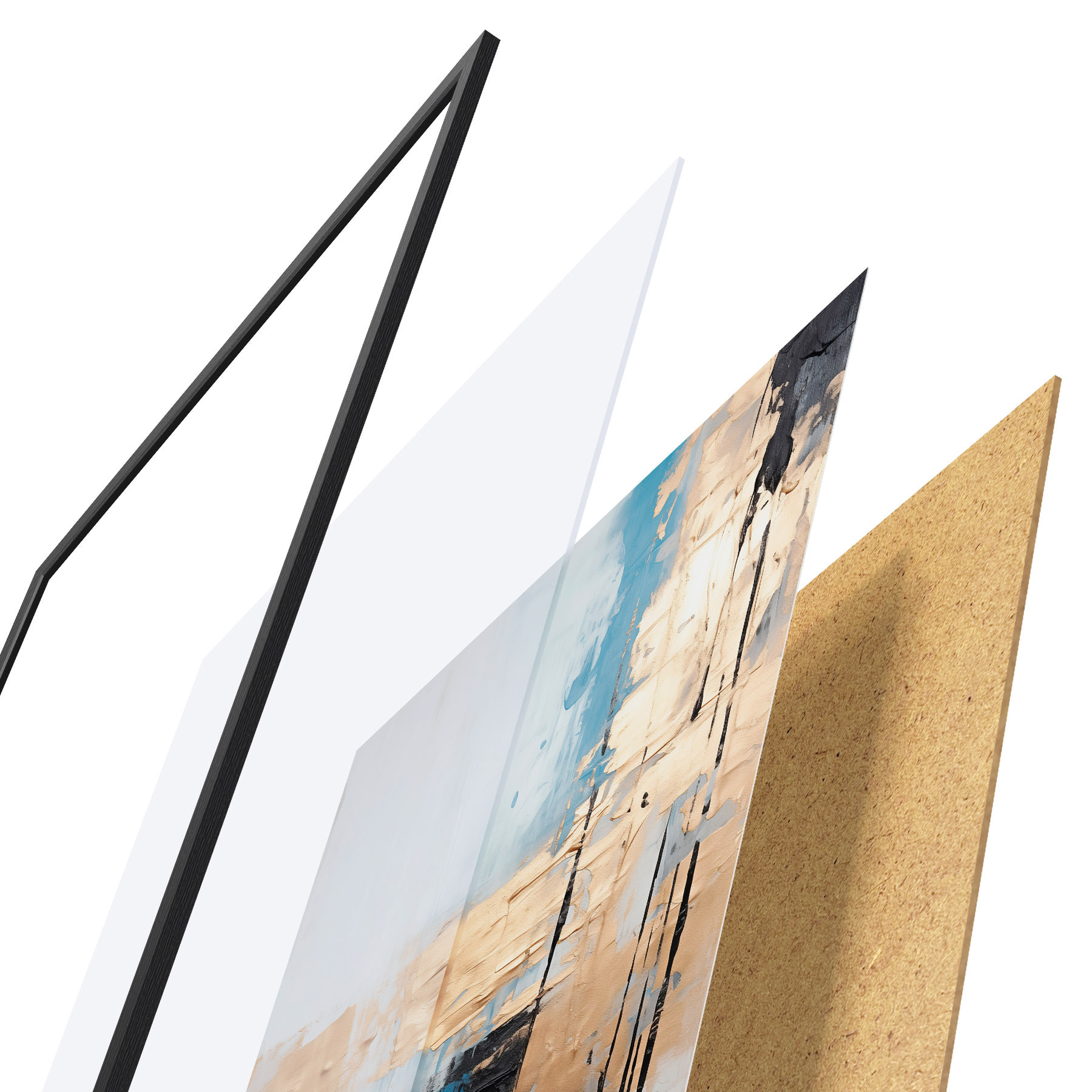 Plakát se skládá z rámu, plexiskla, tištěného obrazu a dřevotřískového podkladu. Díky úchytům na zadní straně lze plakát ihned zavěsit na zeď.