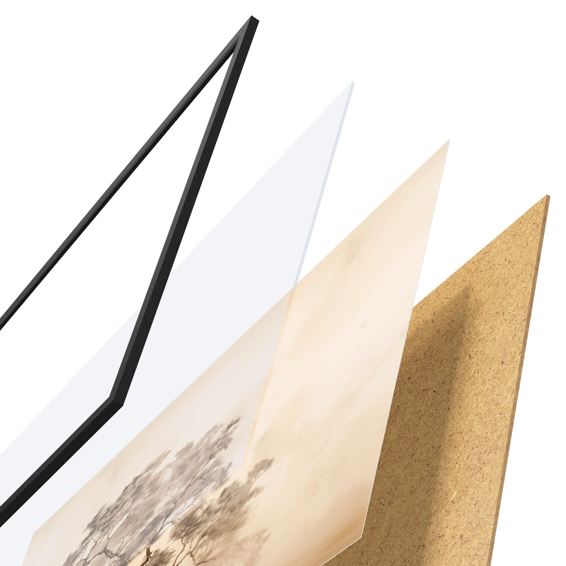 Plakát se skládá z rámu, plexiskla, tištěného obrazu a dřevotřískového podkladu. Díky úchytům na zadní straně lze plakát ihned zavěsit na zeď.