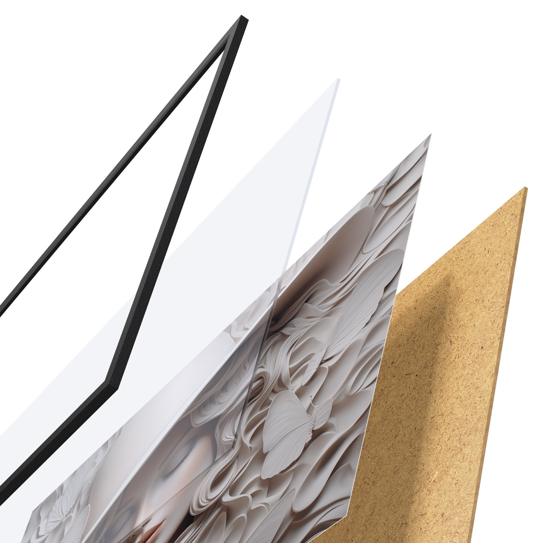 Plakát se skládá z rámu, plexiskla, tištěného obrazu a dřevotřískového podkladu. Díky úchytům na zadní straně lze plakát ihned zavěsit na zeď.