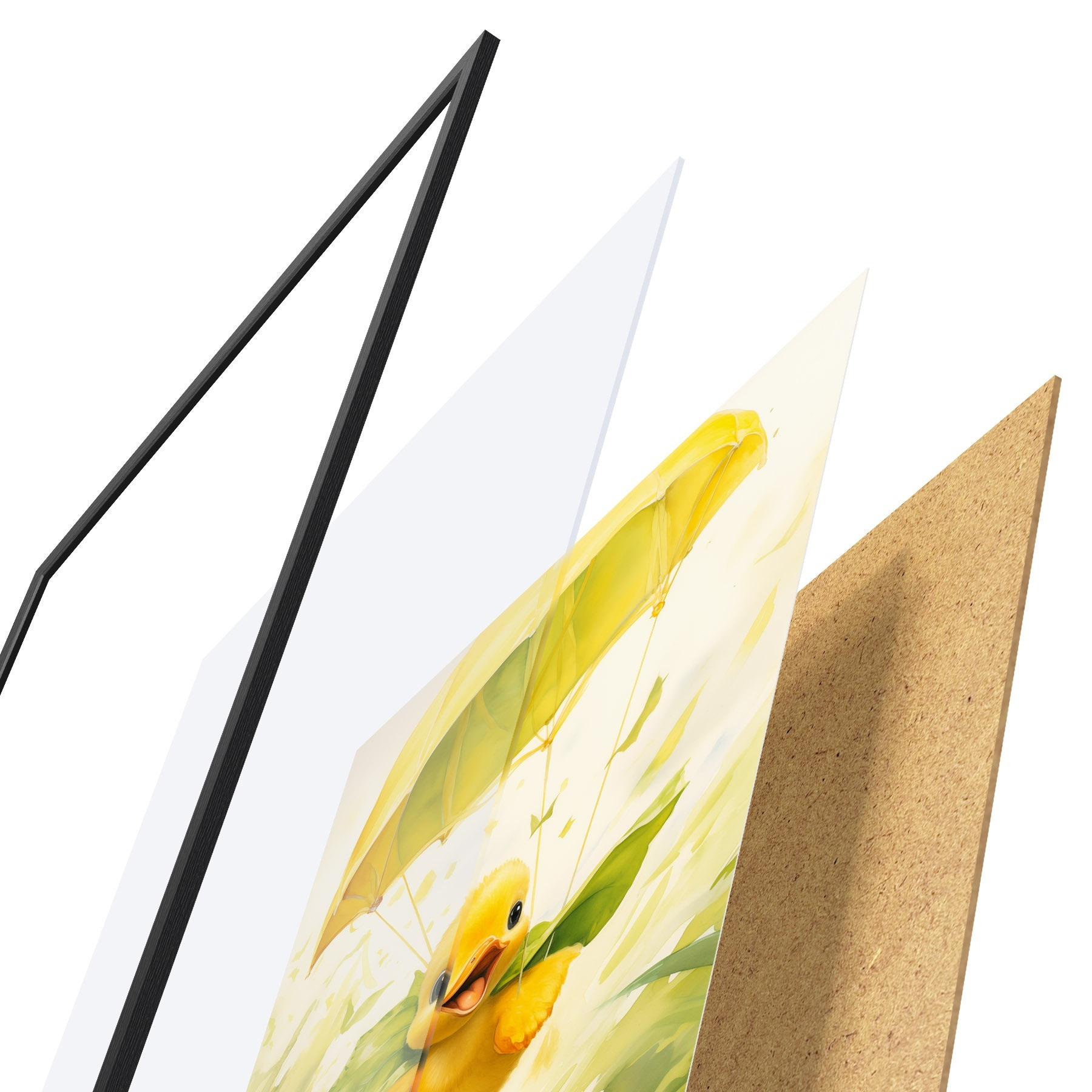 Plakát se skládá z rámu, plexiskla, tištěného obrazu a dřevotřískového podkladu. Díky úchytům na zadní straně lze plakát ihned zavěsit na zeď.