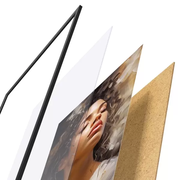 Plakát se skládá z rámu, plexiskla, tištěného obrazu a dřevotřískového podkladu. Díky úchytům na zadní straně lze plakát ihned zavěsit na zeď.