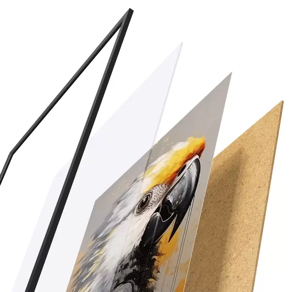 Plakát se skládá z rámu, plexiskla, tištěného obrazu a dřevotřískového podkladu. Díky úchytům na zadní straně lze plakát ihned zavěsit na zeď.
