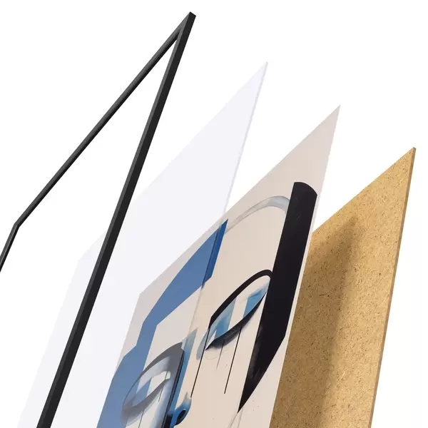 Plakát se skládá z rámu, plexiskla, tištěného obrazu a dřevotřískového podkladu. Díky úchytům na zadní straně lze plakát ihned zavěsit na zeď.