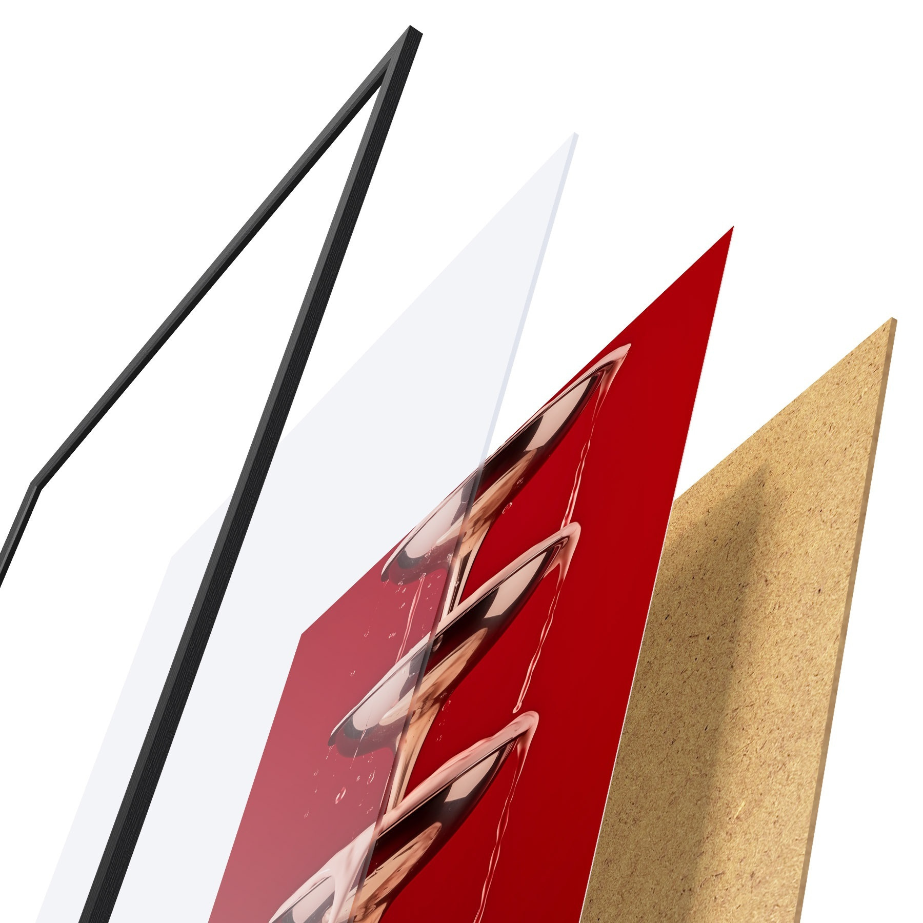 Plakát se skládá z rámu, plexiskla, tištěného obrazu a dřevotřískového podkladu. Díky úchytům na zadní straně lze plakát ihned zavěsit na zeď.