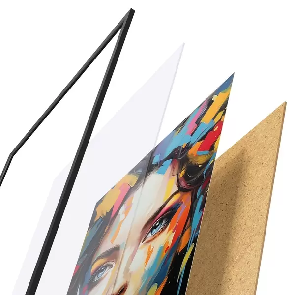 Plakát se skládá z rámu, plexiskla, tištěného obrazu a dřevotřískového podkladu. Díky úchytům na zadní straně lze plakát ihned zavěsit na zeď.