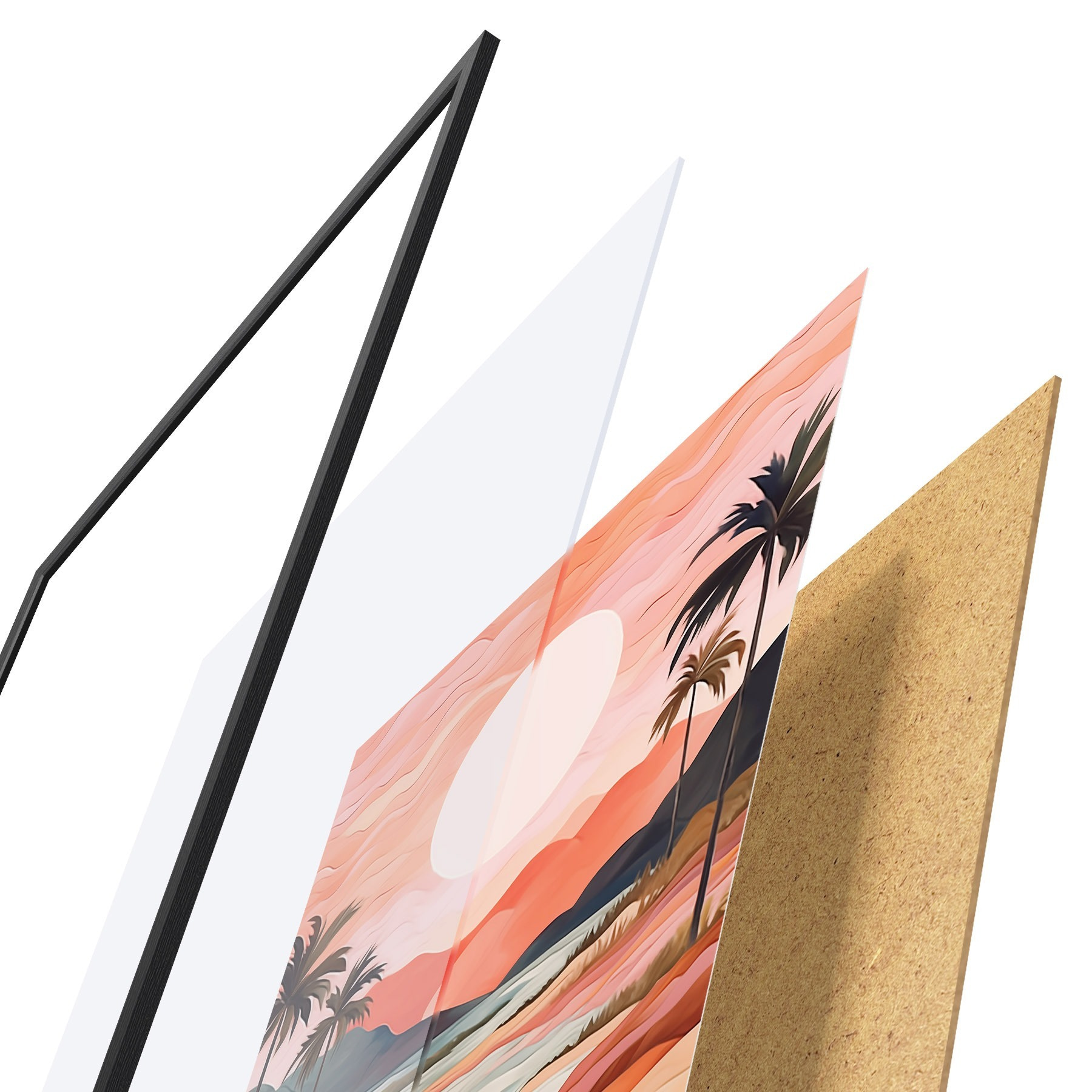 Plakát se skládá z rámu, plexiskla, tištěného obrazu a dřevotřískového podkladu. Díky úchytům na zadní straně lze plakát ihned zavěsit na zeď.