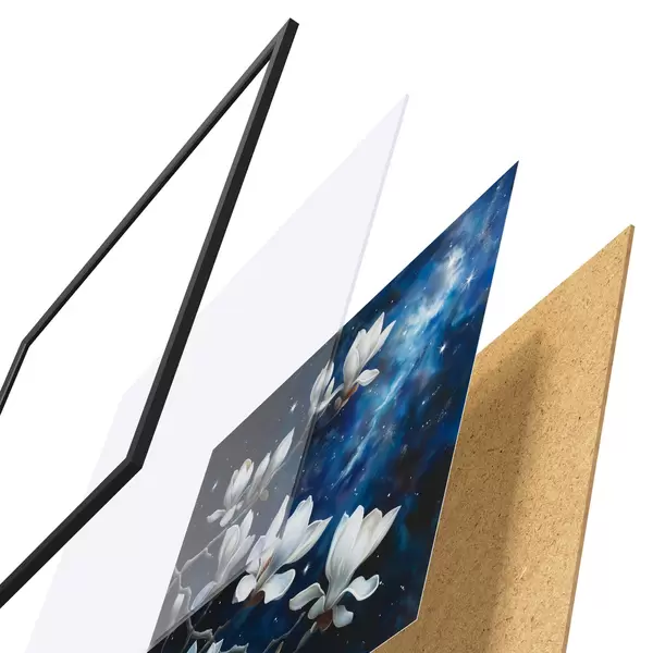 Plakát se skládá z rámu, plexiskla, tištěného obrazu a dřevotřískového podkladu. Díky úchytům na zadní straně lze plakát ihned zavěsit na zeď.