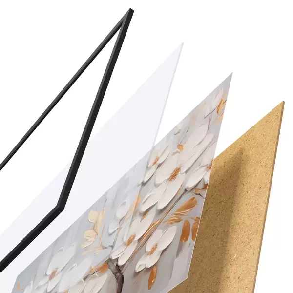 Plakát se skládá z rámu, plexiskla, tištěného obrazu a dřevotřískového podkladu. Díky úchytům na zadní straně lze plakát ihned zavěsit na zeď.