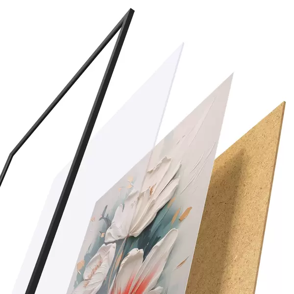 Plakát se skládá z rámu, plexiskla, tištěného obrazu a dřevotřískového podkladu. Díky úchytům na zadní straně lze plakát ihned zavěsit na zeď.