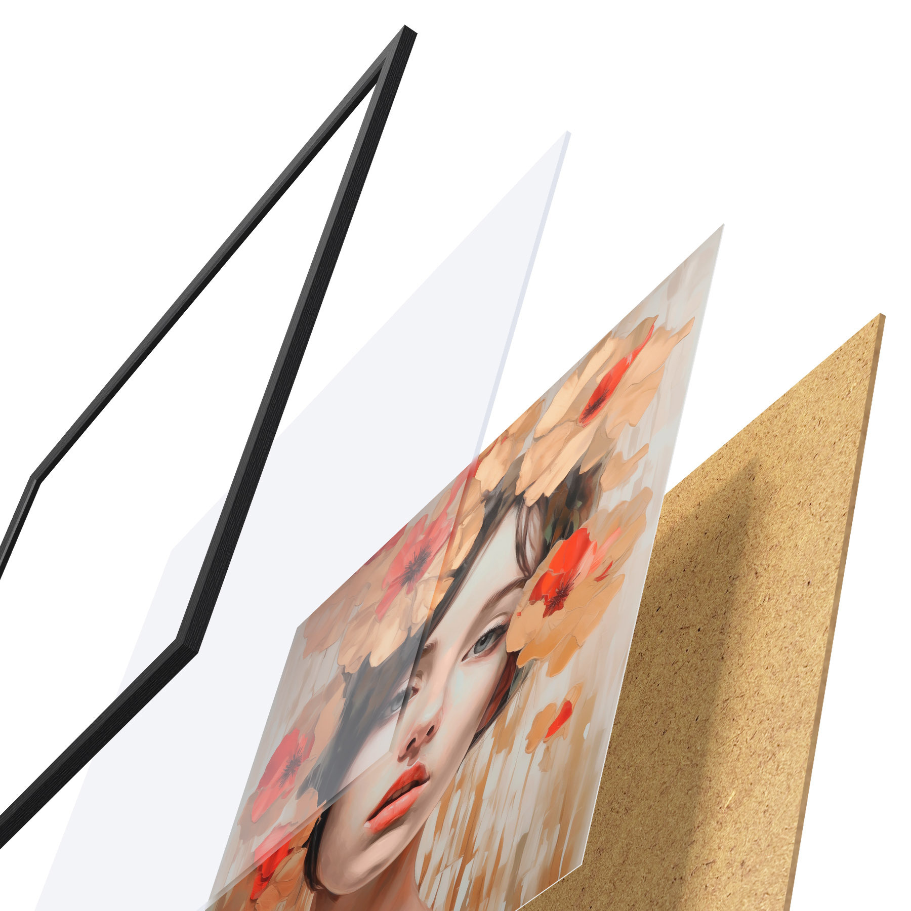 Plakát se skládá z rámu, plexiskla, tištěného obrazu a dřevotřískového podkladu. Díky úchytům na zadní straně lze plakát ihned zavěsit na zeď.