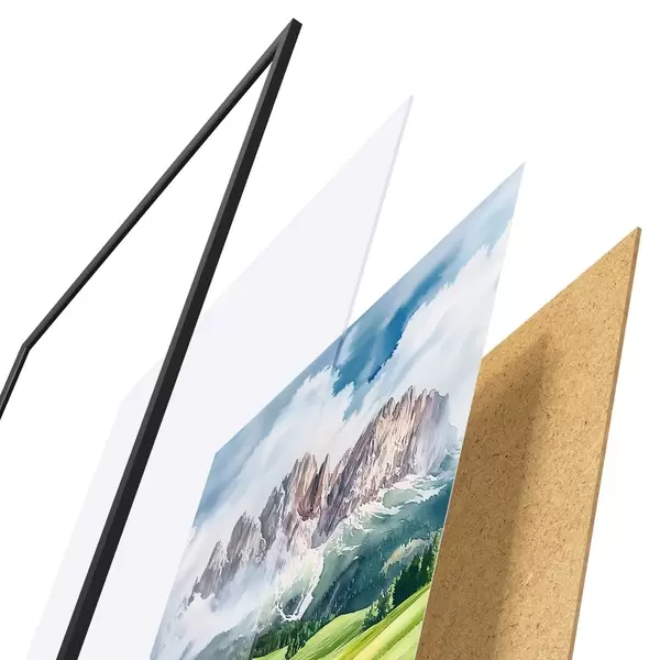 Plakát se skládá z rámu, plexiskla, tištěného obrazu a dřevotřískového podkladu. Díky úchytům na zadní straně lze plakát ihned zavěsit na zeď.