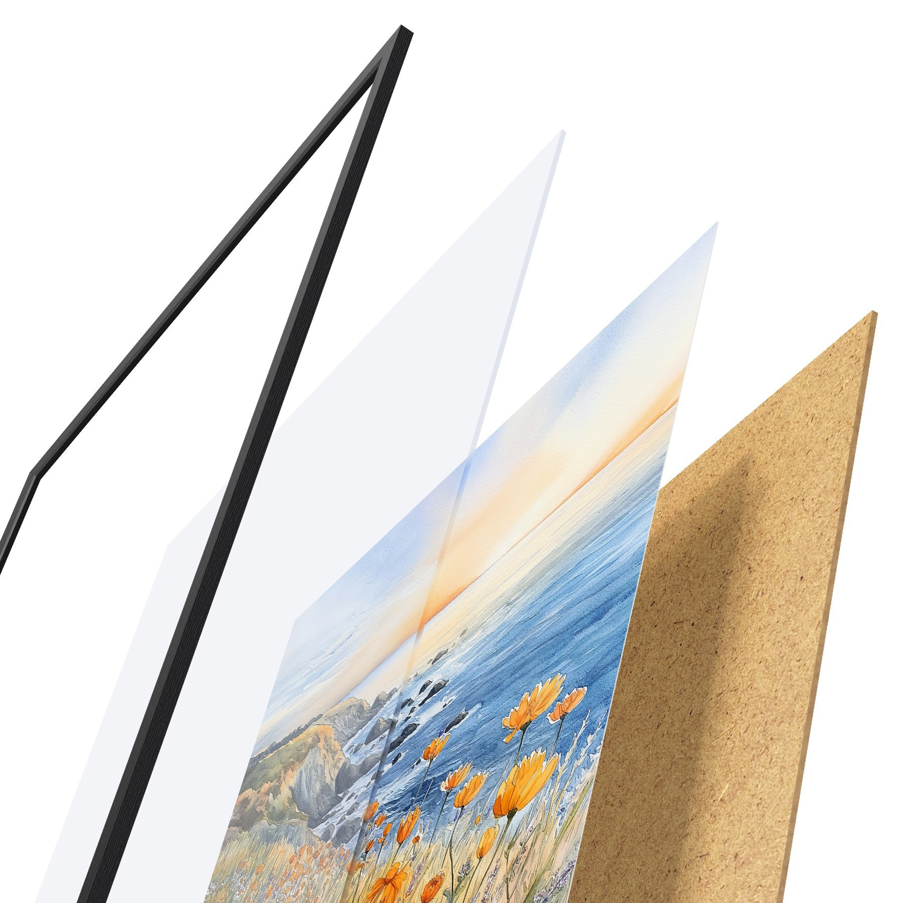 Plakát se skládá z rámu, plexiskla, tištěného obrazu a dřevotřískového podkladu. Díky úchytům na zadní straně lze plakát ihned zavěsit na zeď.