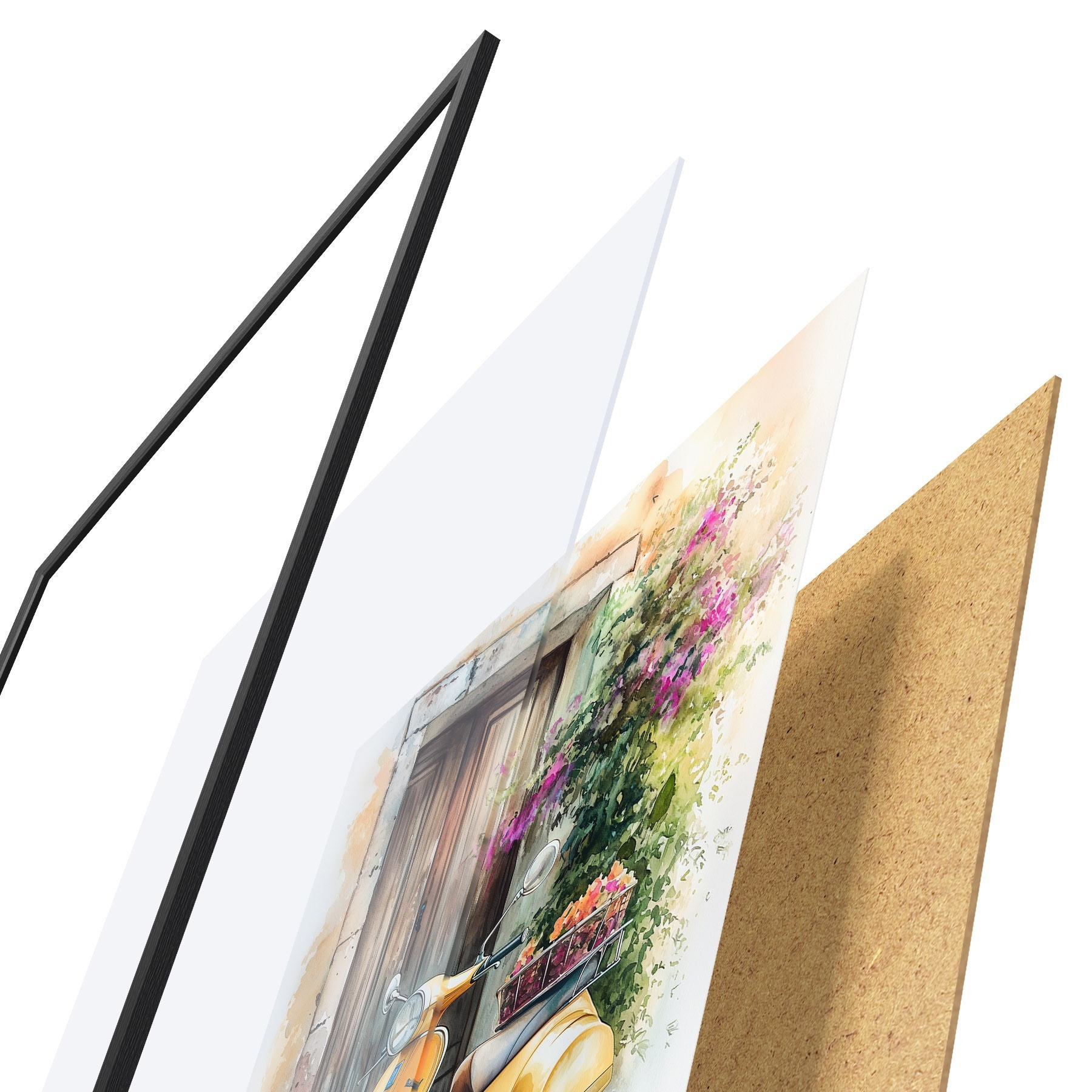 Plakát se skládá z rámu, plexiskla, tištěného obrazu a dřevotřískového podkladu. Díky úchytům na zadní straně lze plakát ihned zavěsit na zeď.