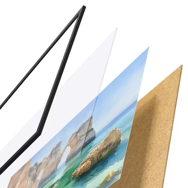 Plakát se skládá z rámu, plexiskla, tištěného obrazu a dřevotřískového podkladu. Díky úchytům na zadní straně lze plakát ihned zavěsit na zeď.
