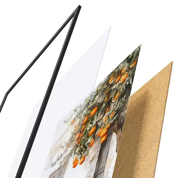 Plakát se skládá z rámu, plexiskla, tištěného obrazu a dřevotřískového podkladu. Díky úchytům na zadní straně lze plakát ihned zavěsit na zeď.