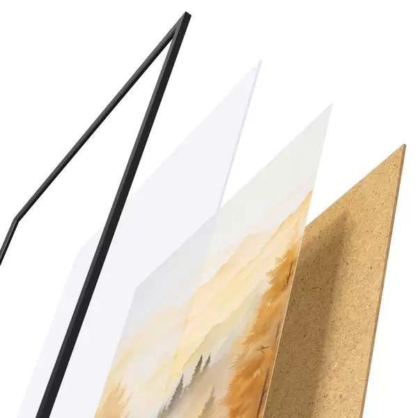 Plakát se skládá z rámu, plexiskla, tištěného obrazu a dřevotřískového podkladu. Díky úchytům na zadní straně lze plakát ihned zavěsit na zeď.