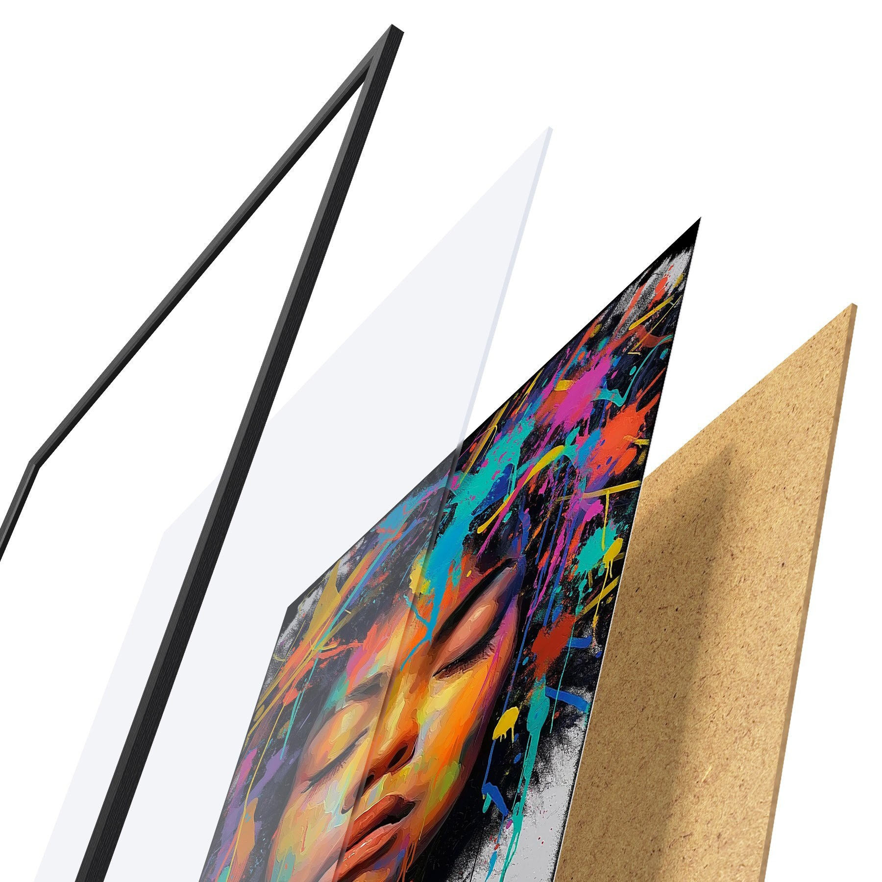 Plakát se skládá z rámu, plexiskla, tištěného obrazu a dřevotřískového podkladu. Díky úchytům na zadní straně lze plakát ihned zavěsit na zeď.
