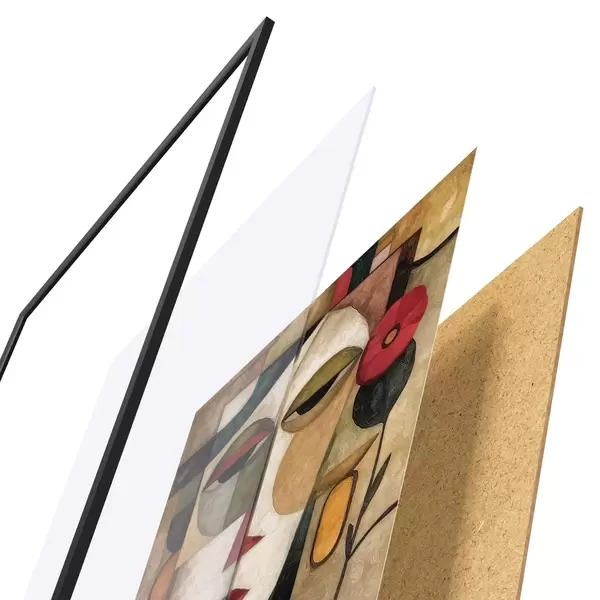 Plakát se skládá z rámu, plexiskla, tištěného obrazu a dřevotřískového podkladu. Díky úchytům na zadní straně lze plakát ihned zavěsit na zeď.