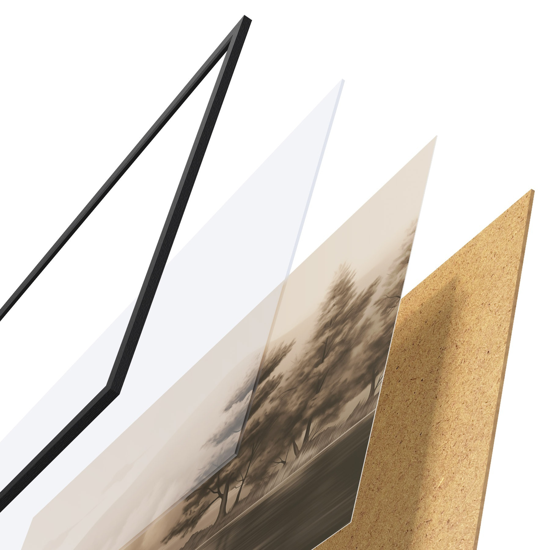 Plakát se skládá z rámu, plexiskla, tištěného obrazu a dřevotřískového podkladu. Díky úchytům na zadní straně lze plakát ihned zavěsit na zeď.