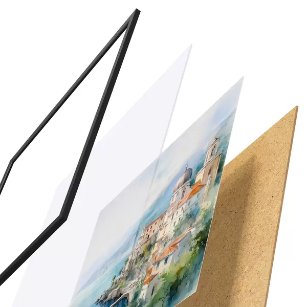 Plakát se skládá z rámu, plexiskla, tištěného obrazu a dřevotřískového podkladu. Díky úchytům na zadní straně lze plakát ihned zavěsit na zeď.