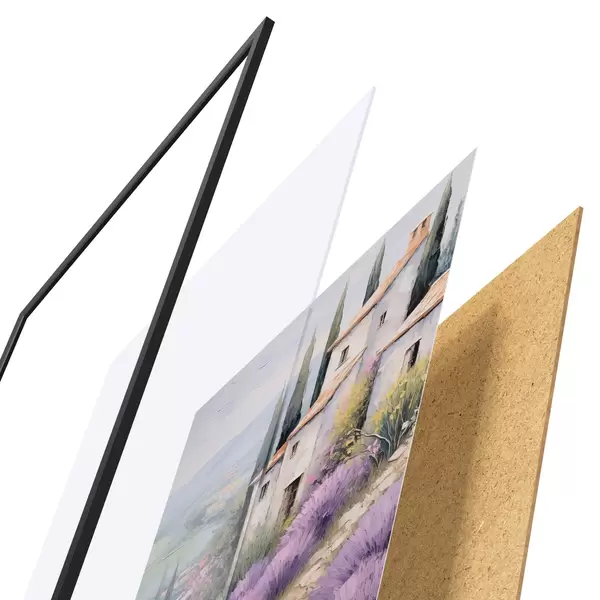 Plakát se skládá z rámu, plexiskla, tištěného obrazu a dřevotřískového podkladu. Díky úchytům na zadní straně lze plakát ihned zavěsit na zeď.