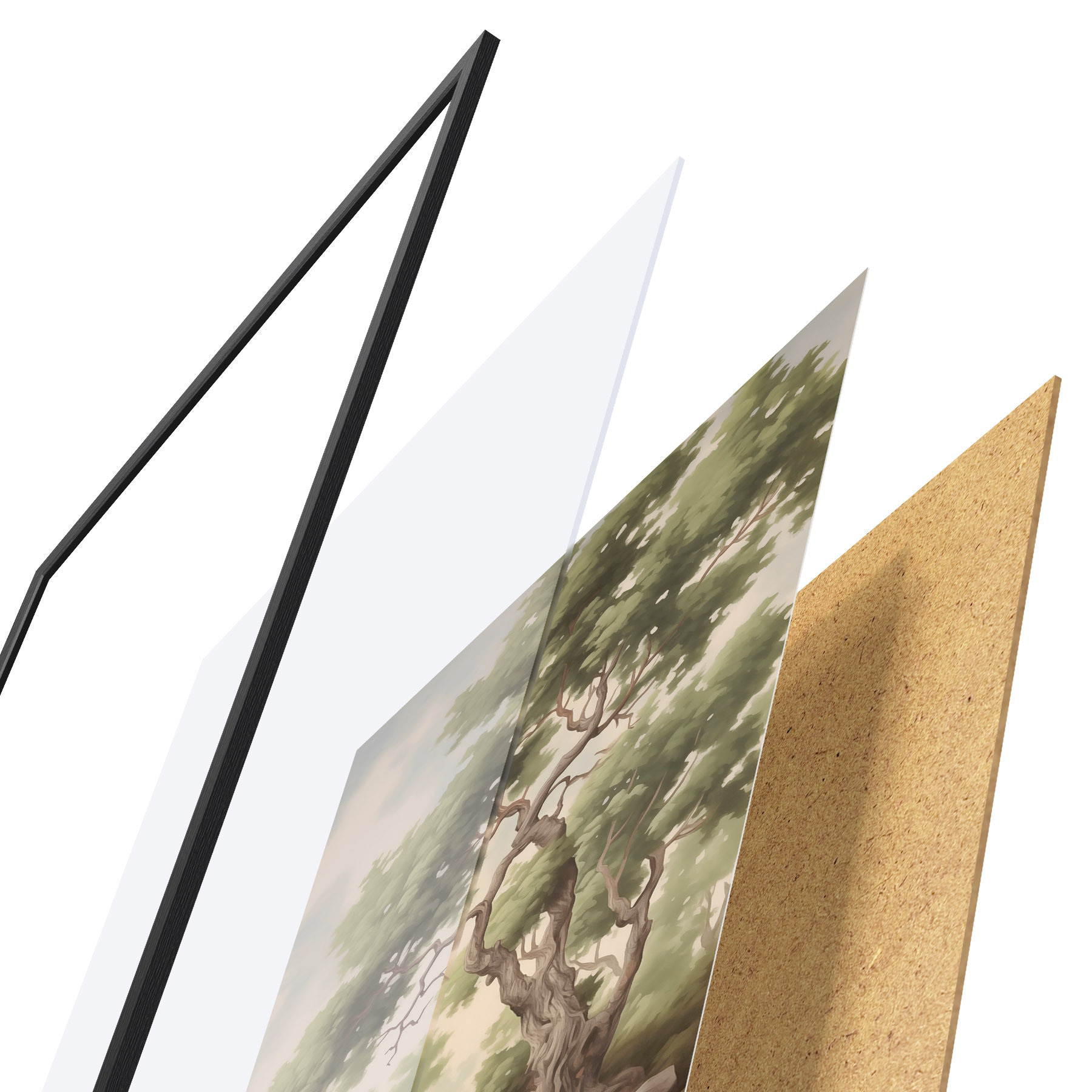 Plakát se skládá z rámu, plexiskla, tištěného obrazu a dřevotřískového podkladu. Díky úchytům na zadní straně lze plakát ihned zavěsit na zeď.