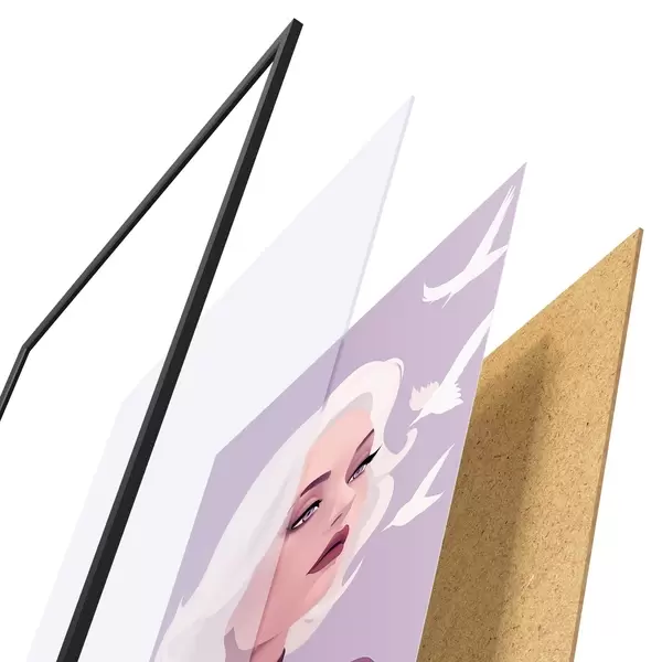 Plakát se skládá z rámu, plexiskla, tištěného obrazu a dřevotřískového podkladu. Díky úchytům na zadní straně lze plakát ihned zavěsit na zeď.