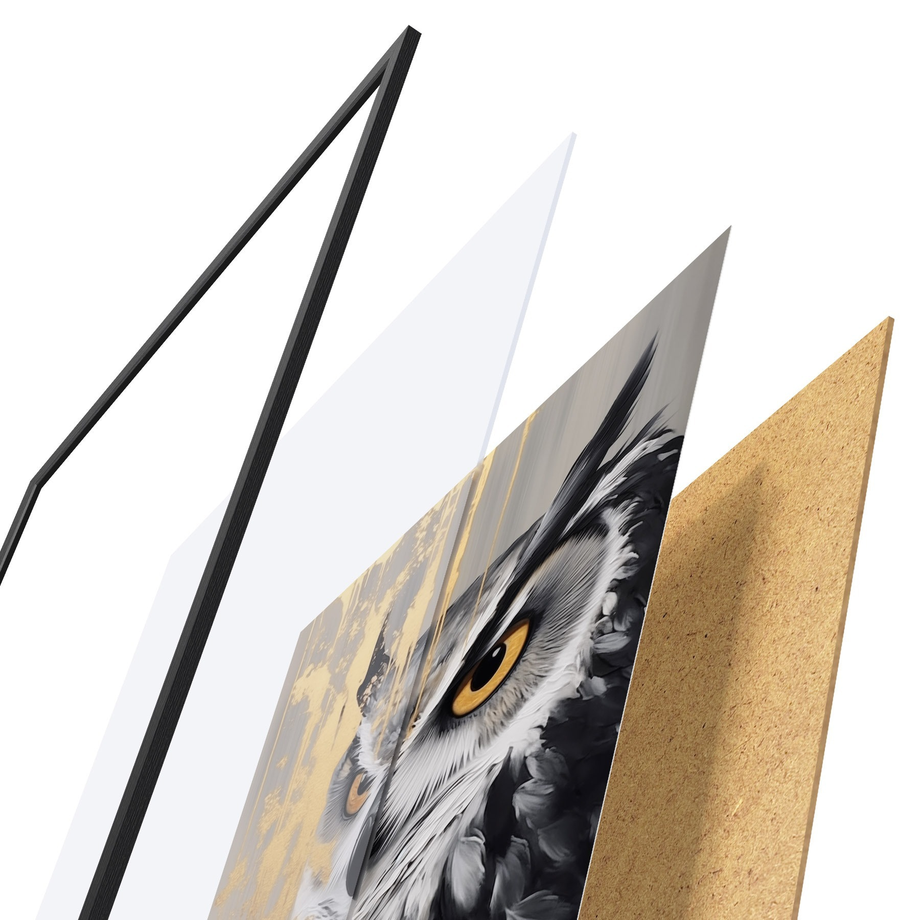 Plakát se skládá z rámu, plexiskla, tištěného obrazu a dřevotřískového podkladu. Díky úchytům na zadní straně lze plakát ihned zavěsit na zeď.
