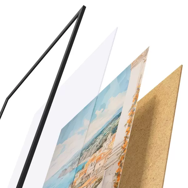 Plakát se skládá z rámu, plexiskla, tištěného obrazu a dřevotřískového podkladu. Díky úchytům na zadní straně lze plakát ihned zavěsit na zeď.