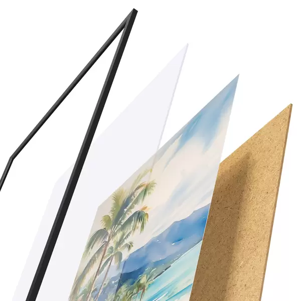 Plakát se skládá z rámu, plexiskla, tištěného obrazu a dřevotřískového podkladu. Díky úchytům na zadní straně lze plakát ihned zavěsit na zeď.