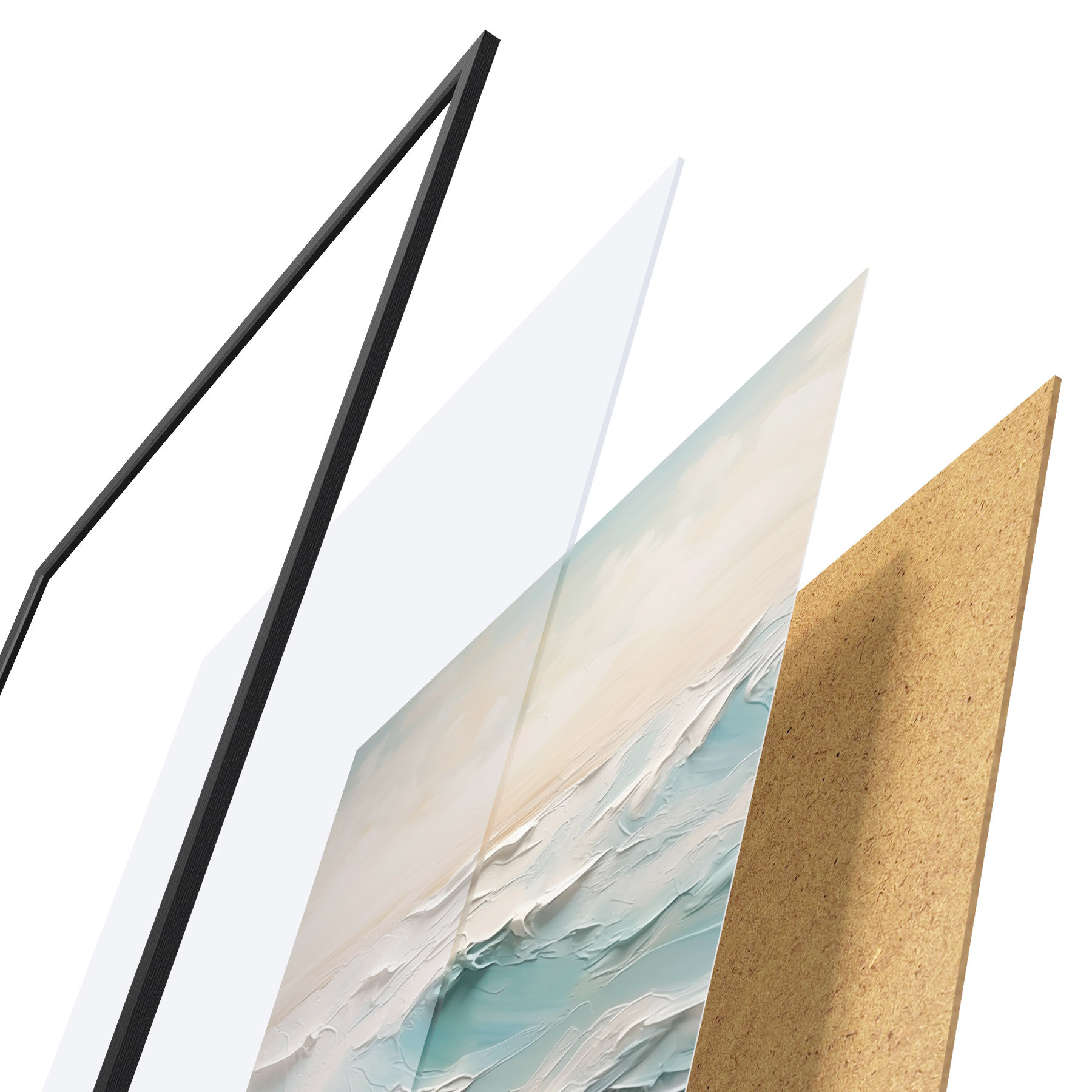 Plakát se skládá z rámu, plexiskla, tištěného obrazu a dřevotřískového podkladu. Díky úchytům na zadní straně lze plakát ihned zavěsit na zeď.