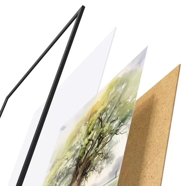 Plakát se skládá z rámu, plexiskla, tištěného obrazu a dřevotřískového podkladu. Díky úchytům na zadní straně lze plakát ihned zavěsit na zeď.