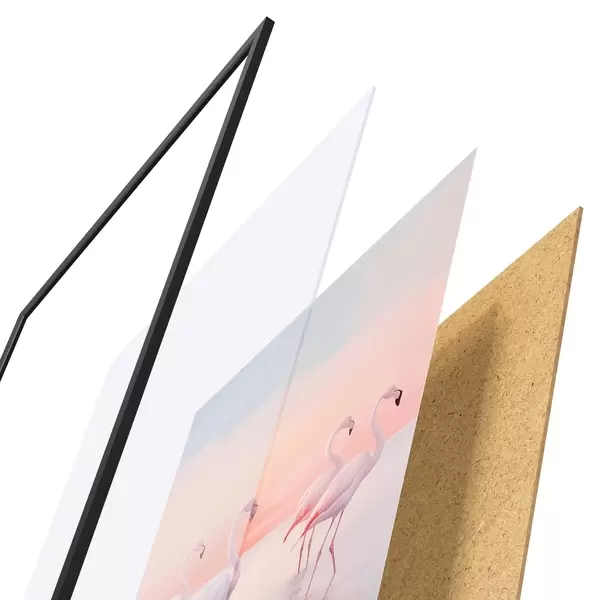 Plakát se skládá z rámu, plexiskla, tištěného obrazu a dřevotřískového podkladu. Díky úchytům na zadní straně lze plakát ihned zavěsit na zeď.
