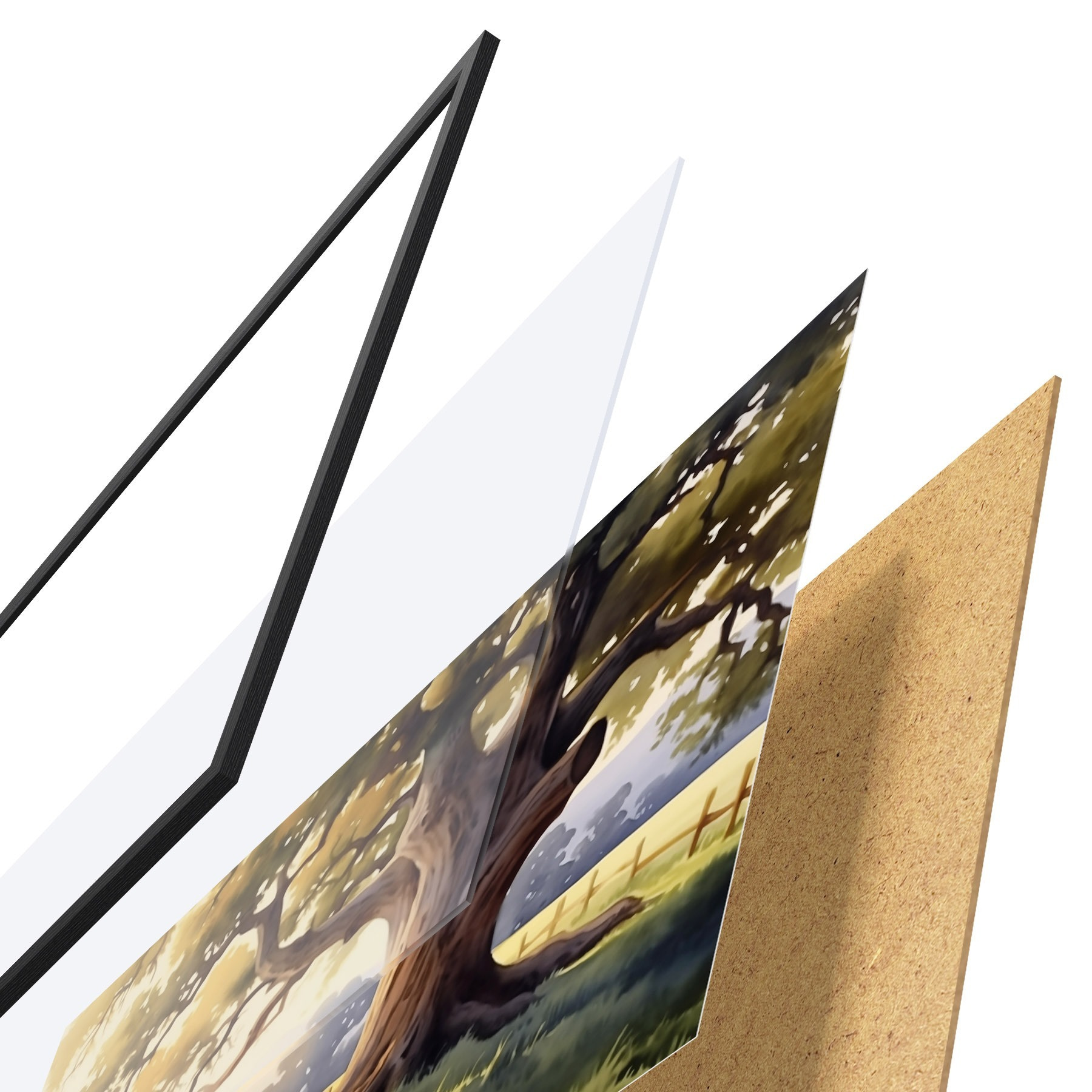 Plakát se skládá z rámu, plexiskla, tištěného obrazu a dřevotřískového podkladu. Díky úchytům na zadní straně lze plakát ihned zavěsit na zeď.
