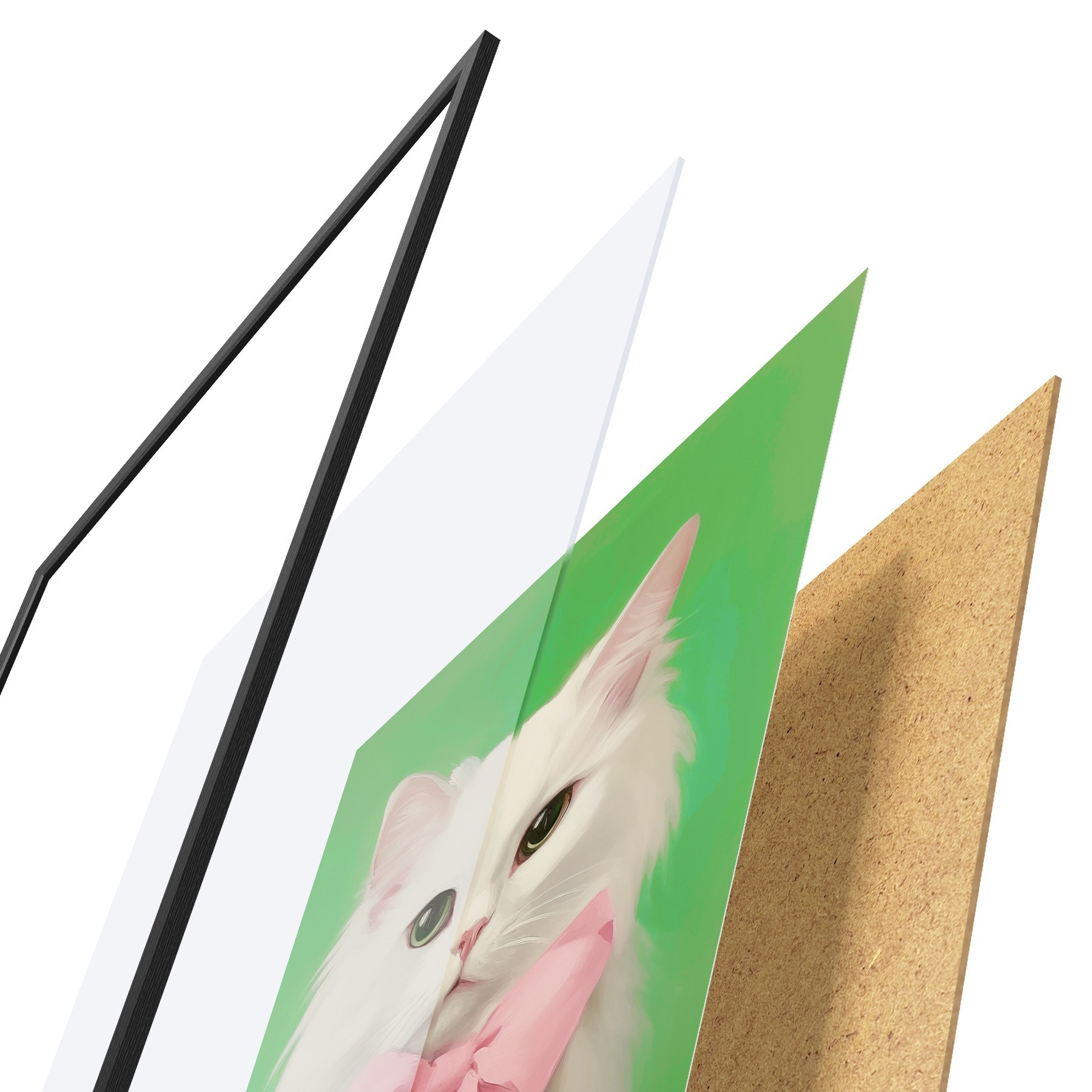 Plakát se skládá z rámu, plexiskla, tištěného obrazu a dřevotřískového podkladu. Díky úchytům na zadní straně lze plakát ihned zavěsit na zeď.