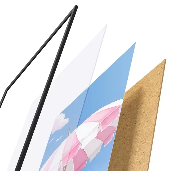 Plakát se skládá z rámu, plexiskla, tištěného obrazu a dřevotřískového podkladu. Díky úchytům na zadní straně lze plakát ihned zavěsit na zeď.