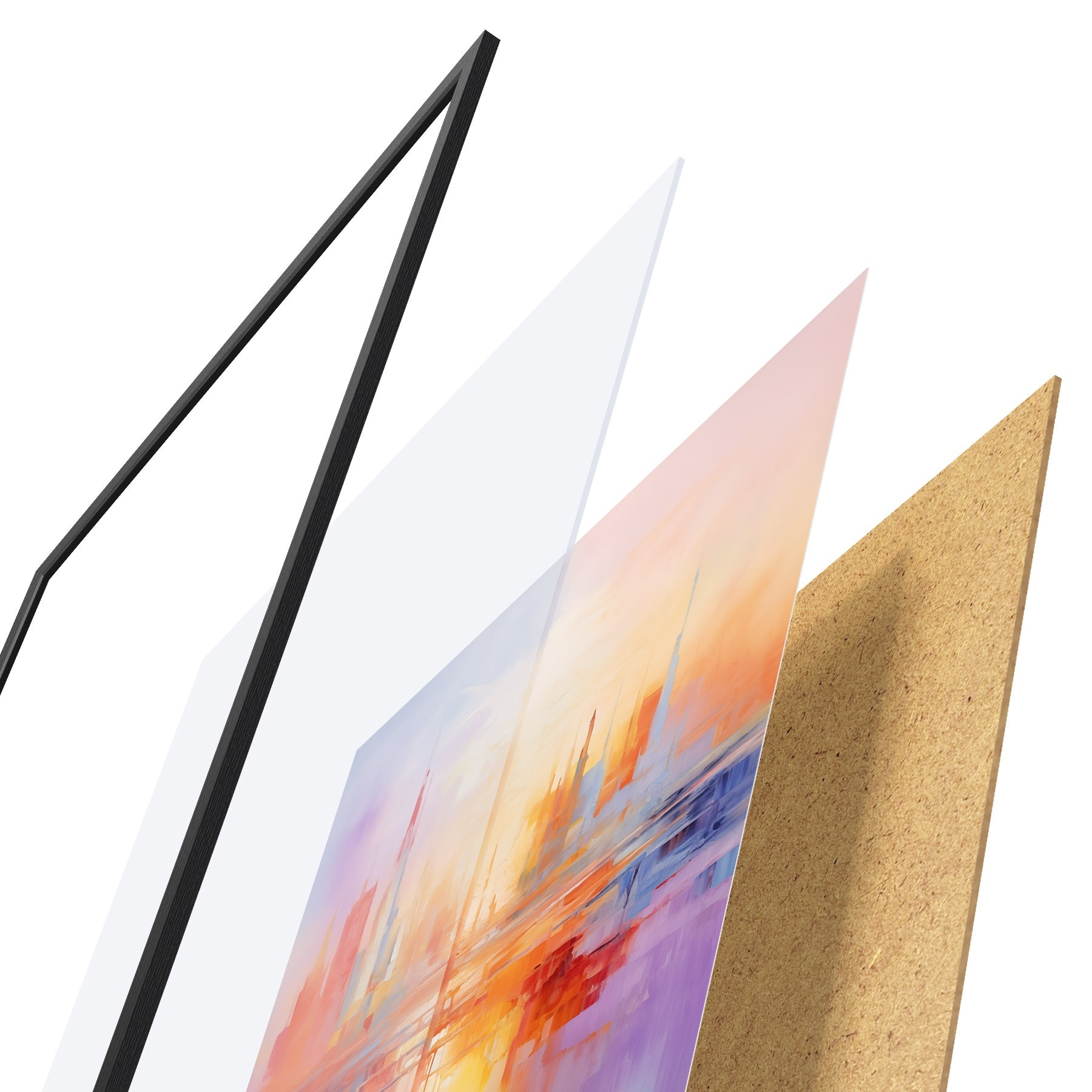 Plakát se skládá z rámu, plexiskla, tištěného obrazu a dřevotřískového podkladu. Díky úchytům na zadní straně lze plakát ihned zavěsit na zeď.