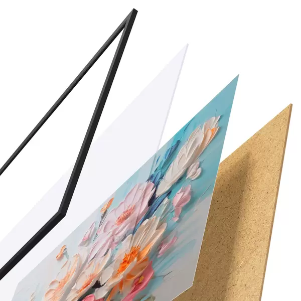 Plakát se skládá z rámu, plexiskla, tištěného obrazu a dřevotřískového podkladu. Díky úchytům na zadní straně lze plakát ihned zavěsit na zeď.