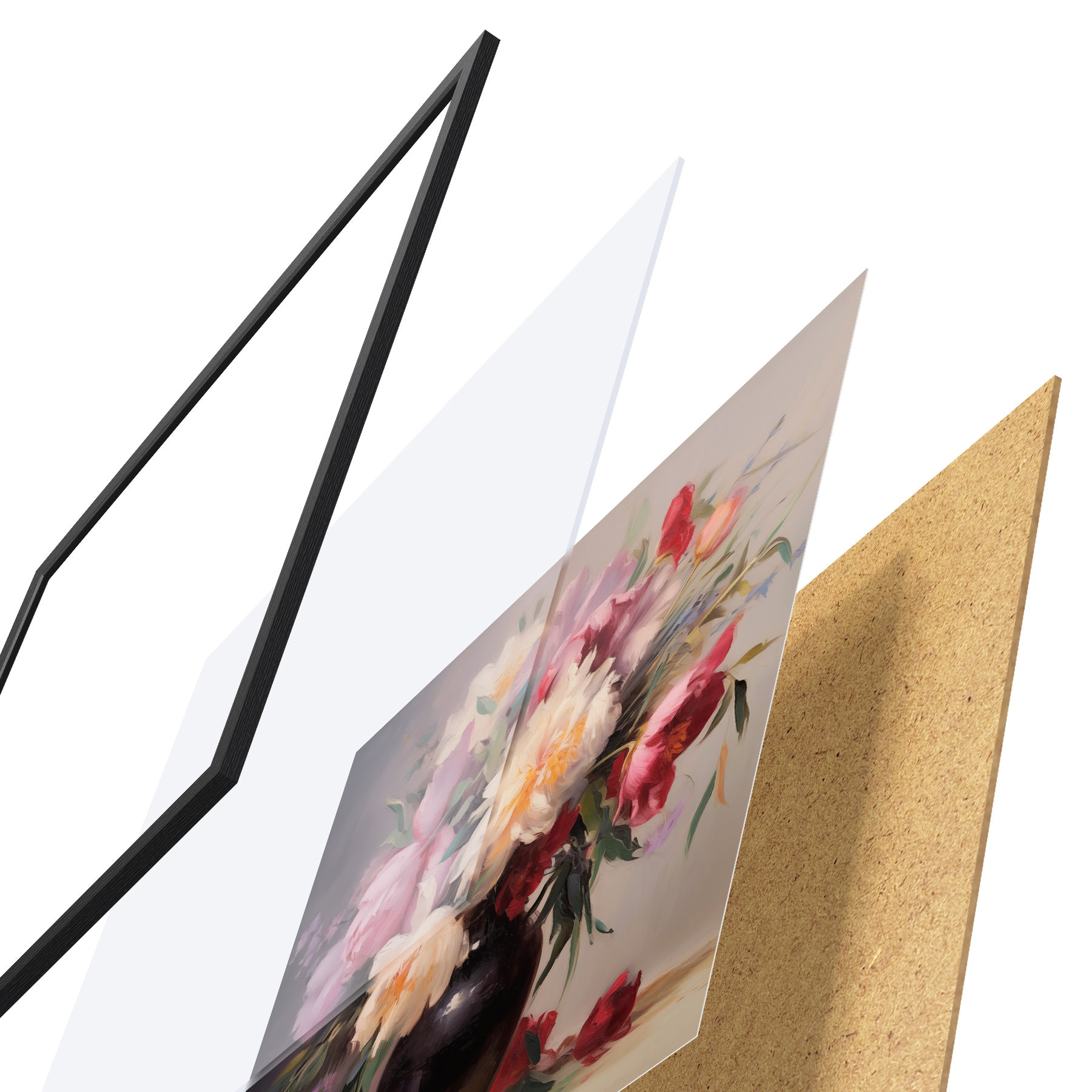 Plakát se skládá z rámu, plexiskla, tištěného obrazu a dřevotřískového podkladu. Díky úchytům na zadní straně lze plakát ihned zavěsit na zeď.