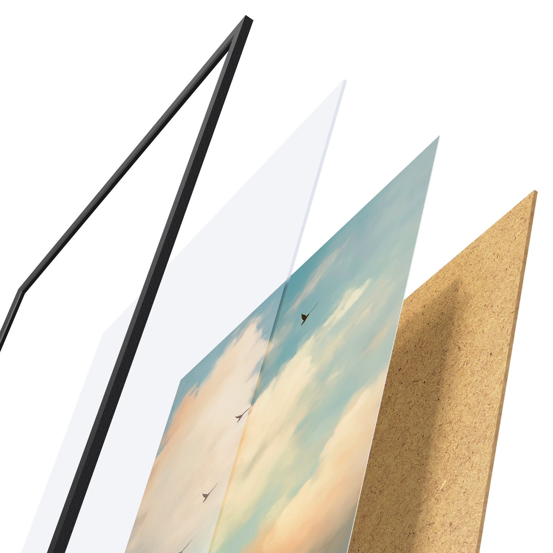 Plakát se skládá z rámu, plexiskla, tištěného obrazu a dřevotřískového podkladu. Díky úchytům na zadní straně lze plakát ihned zavěsit na zeď.