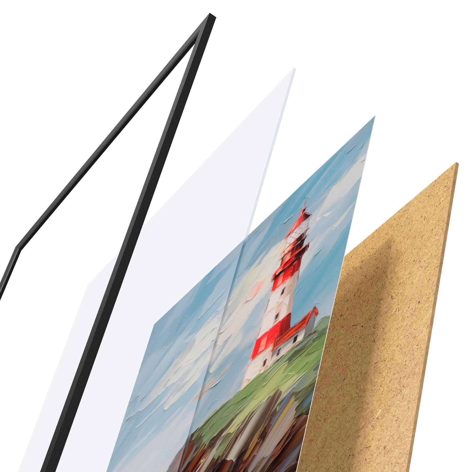 Plakát se skládá z rámu, plexiskla, tištěného obrazu a dřevotřískového podkladu. Díky úchytům na zadní straně lze plakát ihned zavěsit na zeď.