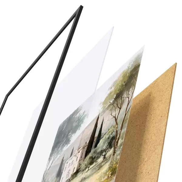 Plakát se skládá z rámu, plexiskla, tištěného obrazu a dřevotřískového podkladu. Díky úchytům na zadní straně lze plakát ihned zavěsit na zeď.
