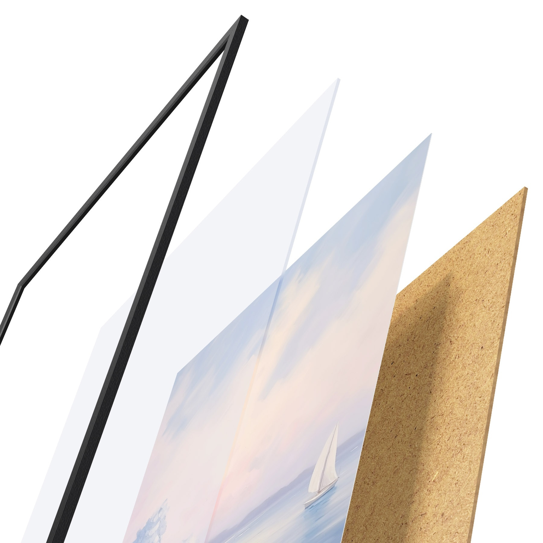 Plakát se skládá z rámu, plexiskla, tištěného obrazu a dřevotřískového podkladu. Díky úchytům na zadní straně lze plakát ihned zavěsit na zeď.