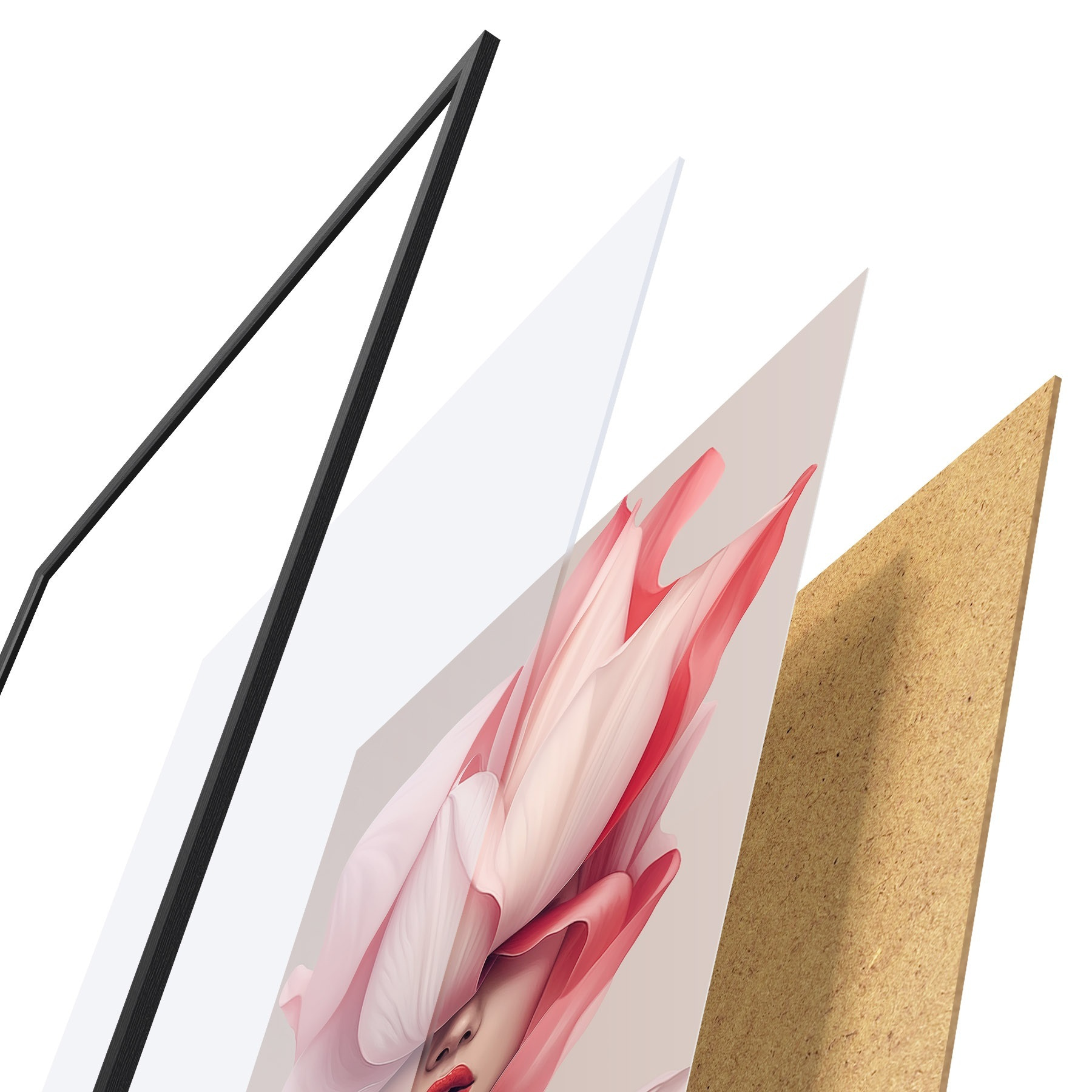 Plakát se skládá z rámu, plexiskla, tištěného obrazu a dřevotřískového podkladu. Díky úchytům na zadní straně lze plakát ihned zavěsit na zeď.