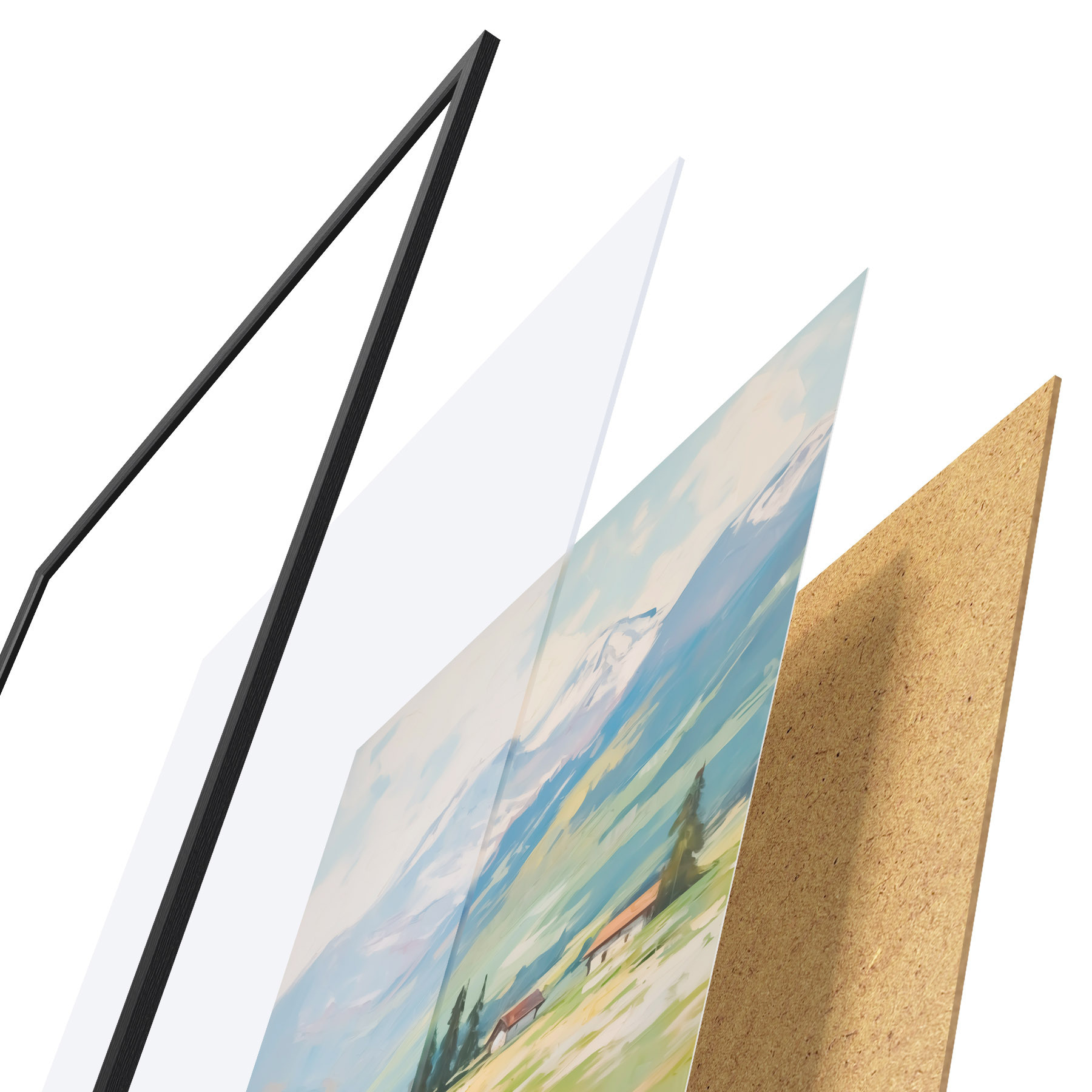 Plakát se skládá z rámu, plexiskla, tištěného obrazu a dřevotřískového podkladu. Díky úchytům na zadní straně lze plakát ihned zavěsit na zeď.