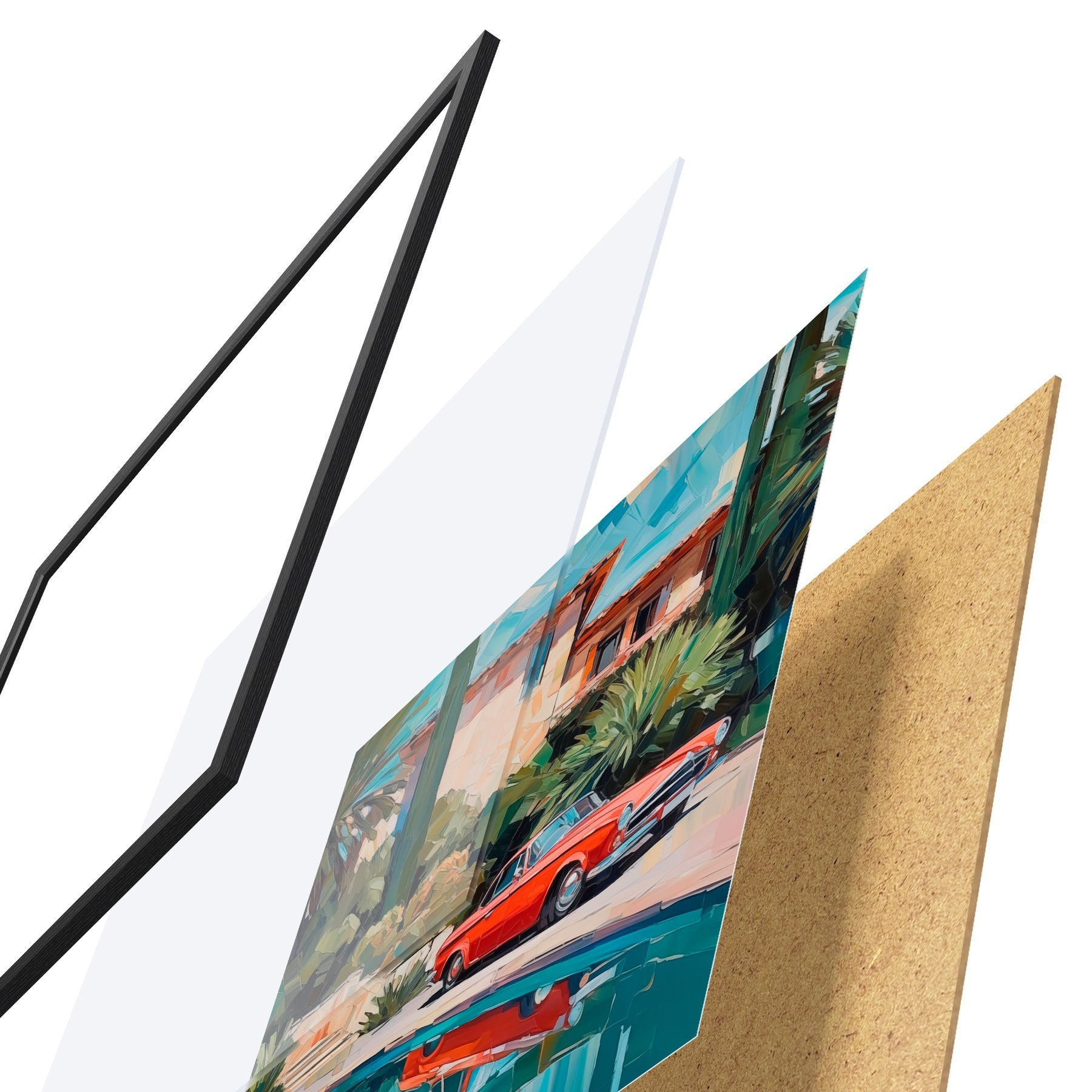 Plakát se skládá z rámu, plexiskla, tištěného obrazu a dřevotřískového podkladu. Díky úchytům na zadní straně lze plakát ihned zavěsit na zeď.