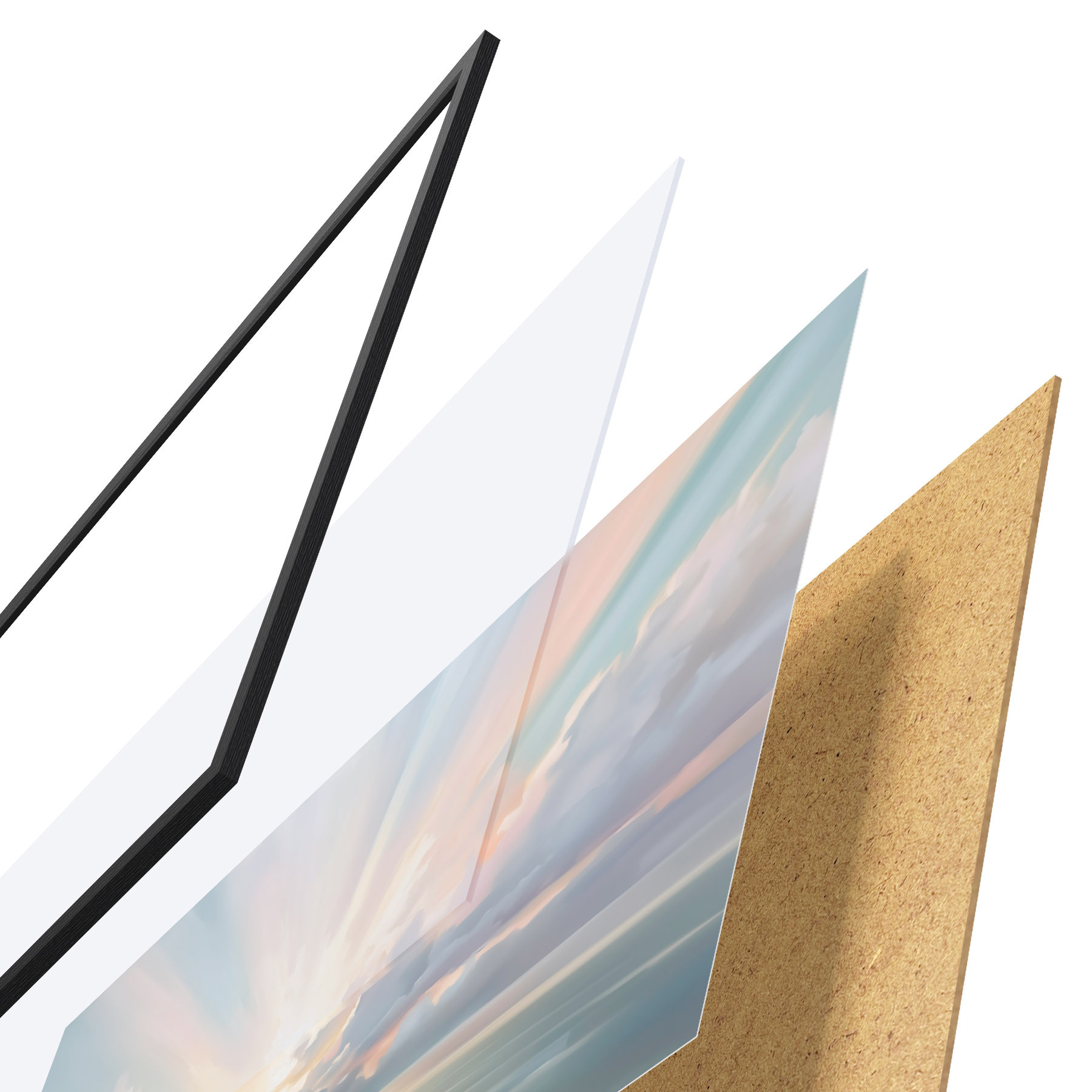 Plakát se skládá z rámu, plexiskla, tištěného obrazu a dřevotřískového podkladu. Díky úchytům na zadní straně lze plakát ihned zavěsit na zeď.