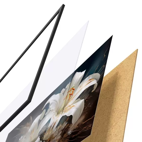 Plakát se skládá z rámu, plexiskla, tištěného obrazu a dřevotřískového podkladu. Díky úchytům na zadní straně lze plakát ihned zavěsit na zeď.