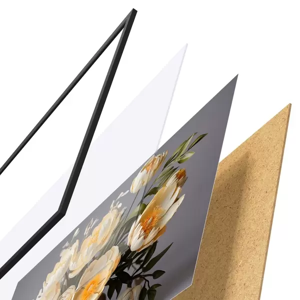 Plakát se skládá z rámu, plexiskla, tištěného obrazu a dřevotřískového podkladu. Díky úchytům na zadní straně lze plakát ihned zavěsit na zeď.